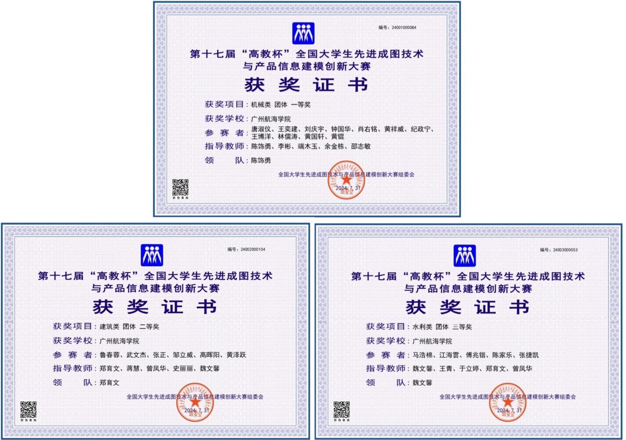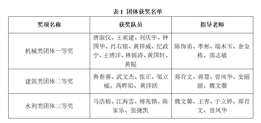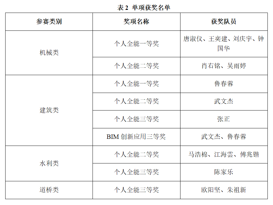 (校团委、yl6809永利检测中心、智能交通与工程学院供稿)近日,第十七届“高教杯”全国大学生先进成图技术与产品信息建模创新大赛在贵州大学成功举办。本届大赛分为机械赛道、水利赛道、道桥赛道、建筑赛道和电子赛道共5个主赛道,本届全国总决赛5个主赛道共有895所学校16294名参赛学生参赛,参赛规模达历史之最。我校4支参赛队伍在指导老师陈饰勇、郑育文、魏文馨、杨娥带领下分别参加机械赛道、建筑赛道、水利赛道、道桥赛道的比赛。此次参赛,4支参赛队伍表现突出、荣获佳绩,获奖名次和获奖人次取得新的突破。获奖情况如下: