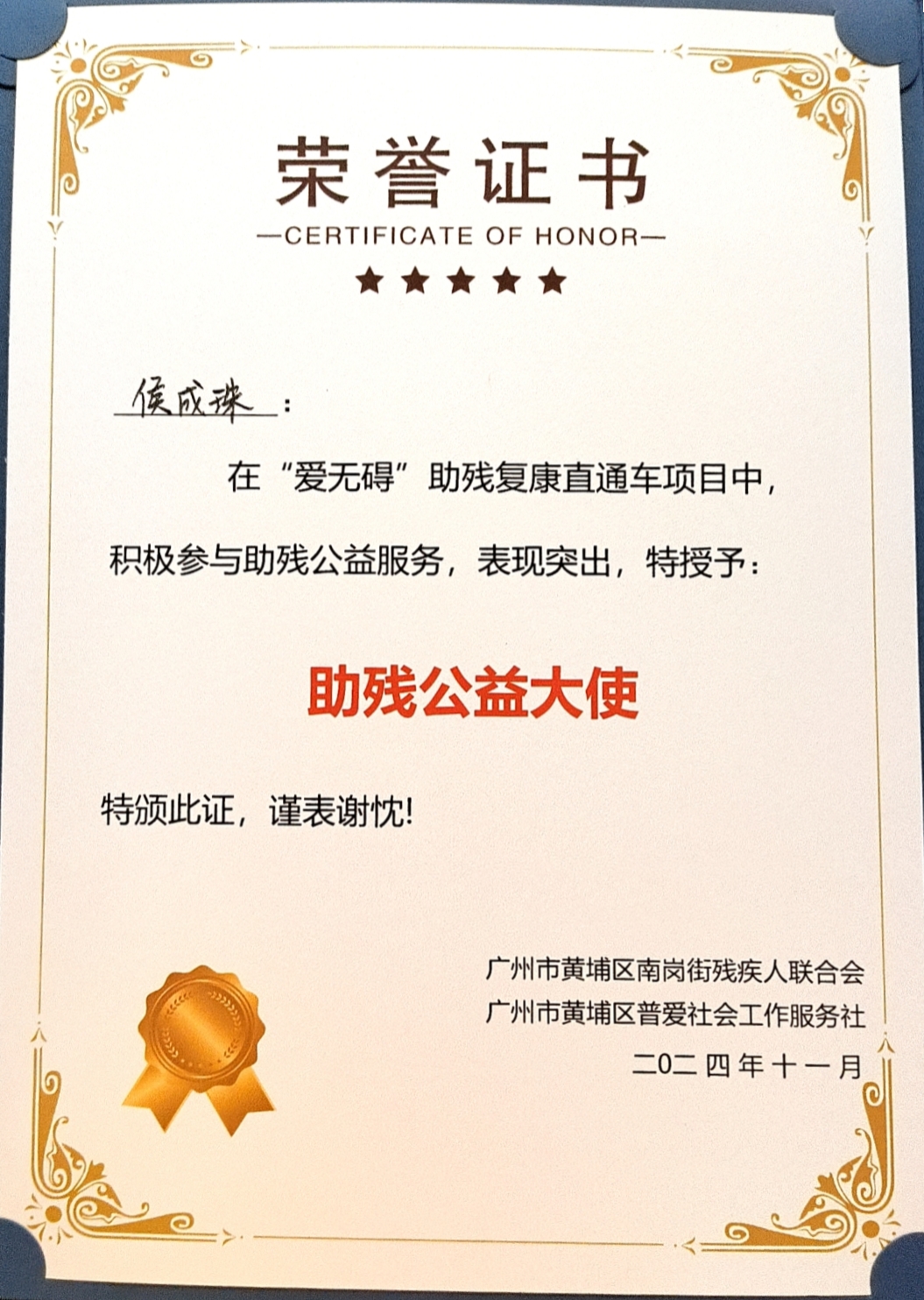 11月10日,由广州市黄埔区南岗街道办事处、黄埔区普爱社会工作服务社共同举办的以“复康有爱·出行无碍”为主题的“爱无碍”助残复康巴士直通车项目成果展暨慈善嘉年华活动在南岗街道融悦汇广场盛大举行。yl6809永利检测中心侯成珠同学在活动中被授予“助残公益大使”荣誉称号。