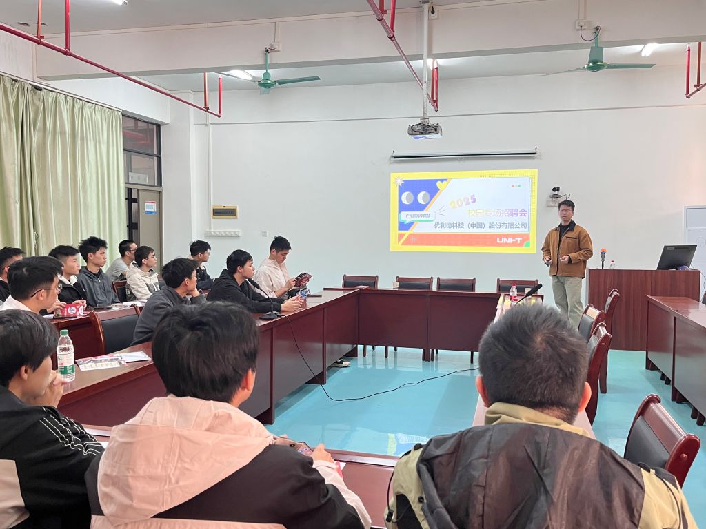 现场,同学们观看了企业宣传视频。随后,彭仕杭经理介绍了公司概况、研发实力、营销网络、管理文化、岗位计划、发展平台、薪酬福利和应聘流程,欢迎同学们投递简历,加入优利德科技。同学们现场就岗位数量、人才培养模式等内容和企业工作人员进行深入交流。