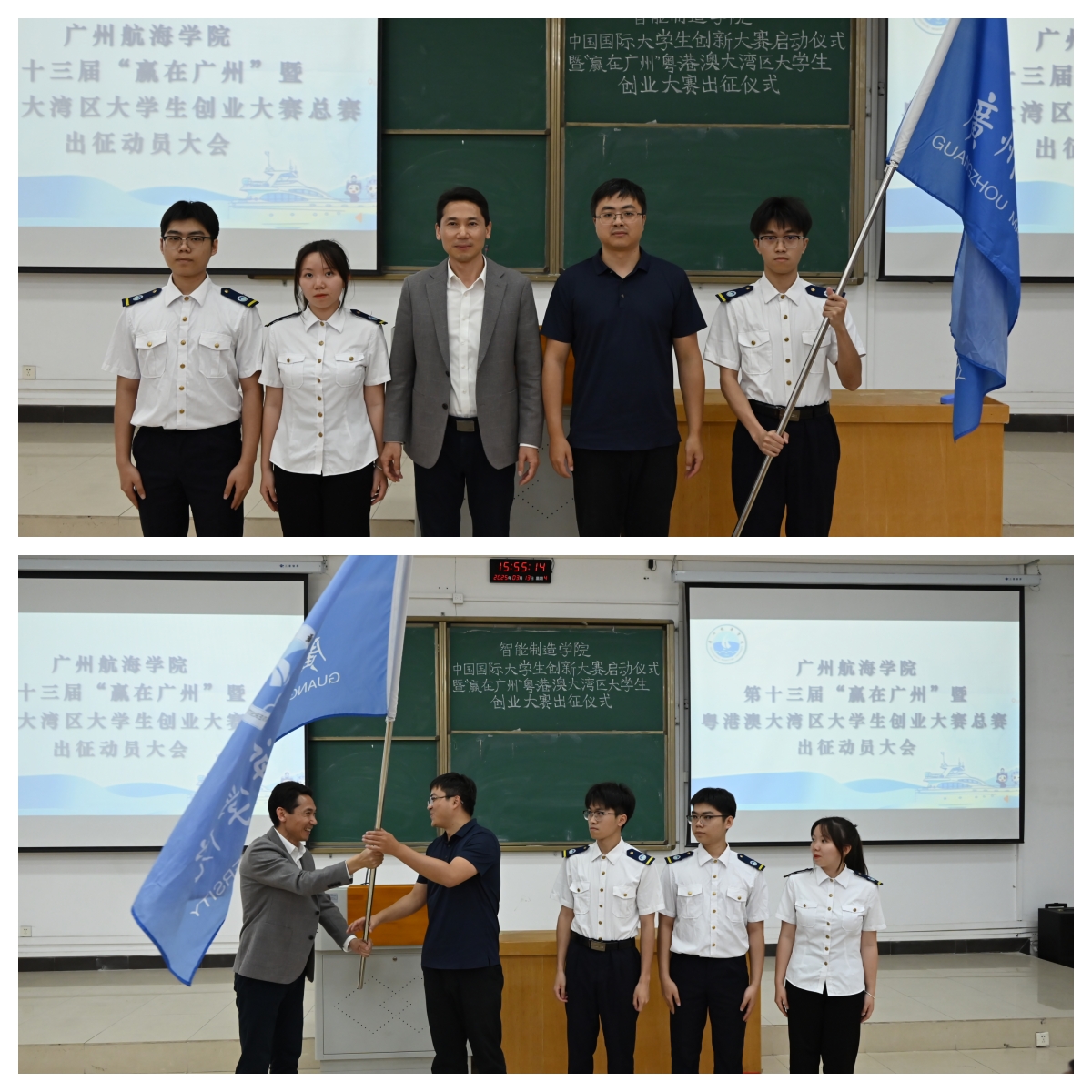 黄咸强为第十三届“赢在广州”暨粤港澳大湾区大学生创业大赛入围总决赛的《翻-航防碰撞张拉整体无人探测器》队伍授旗,并作出征动员讲话。他肯定了学校“以赛促教、以赛促学、以赛促创”的育人模式,对入围总决赛的队伍给予了赞扬。他提出三点希望与师生共勉:“坚定信心,勇创佳绩”“团结协作,相互配合”“虚心学习,提升自我”,鼓励师生们在接下来的比赛中展现风采,为校争光。