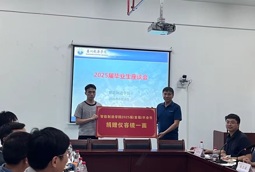 在温馨的捐赠仪式上,毕业生代表向学院赠送了一面仪容镜,寓意“以镜正冠,明德笃行”。李伟光代表学院接受捐赠,并表示这份礼物将放置在学院大厅,见证一届届智造学子的成长。