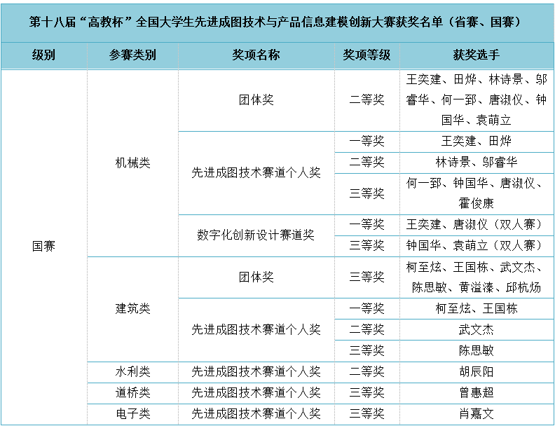 “高教杯”全国大学生先进成图技术与产品信息建模创新大赛由教育部高等学校工程图学课程教学指导委员会、中国图学学会制图技术专业委员会、中国图学学会产品信息建模专业委员会联合主办,2018年入选中国高等教育学会发布的全国普通高校学科竞赛排行榜,是图学类课程最高级别的国家级赛事,被誉为“图学界的奥林匹克”。