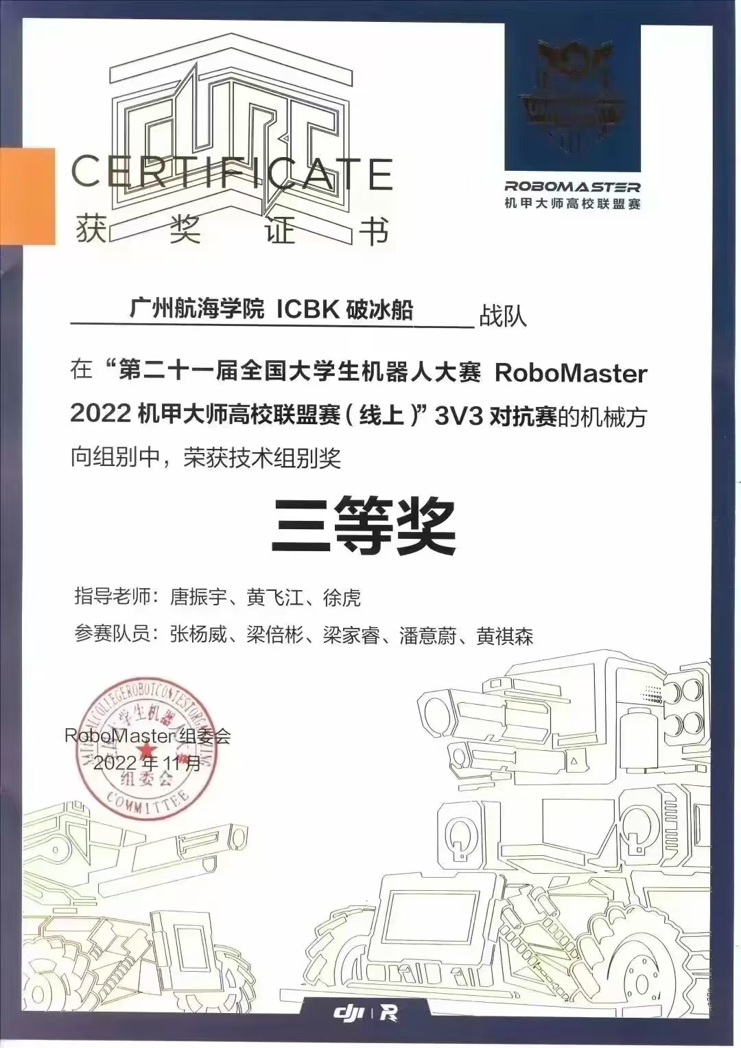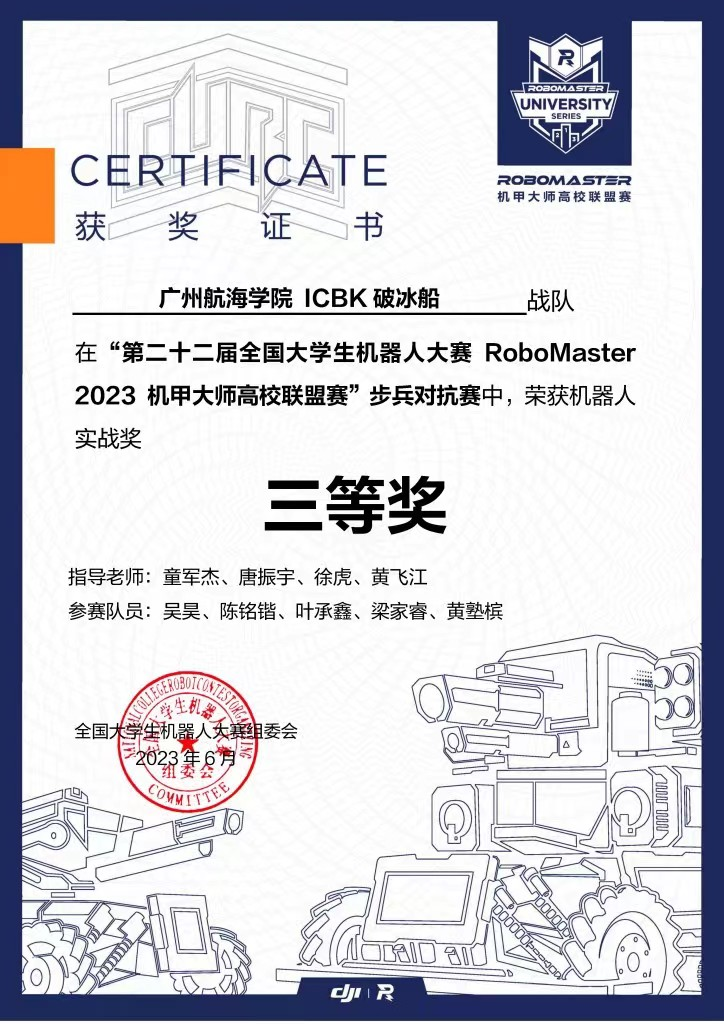 我院参加第二十三届全国大学生机器人大赛RoboMaster机甲大师高校联盟赛荣获实战竞技奖三等奖4项;第二十二届全国大学生机器人大赛RoboMaster机甲大师高校联盟赛荣获实战竞技奖三等奖2项;第二十一届全国大学生机器人大赛RoboMaster机甲大师高校联盟赛(线上)3V3对抗赛荣获机械方向组别三等奖1项。